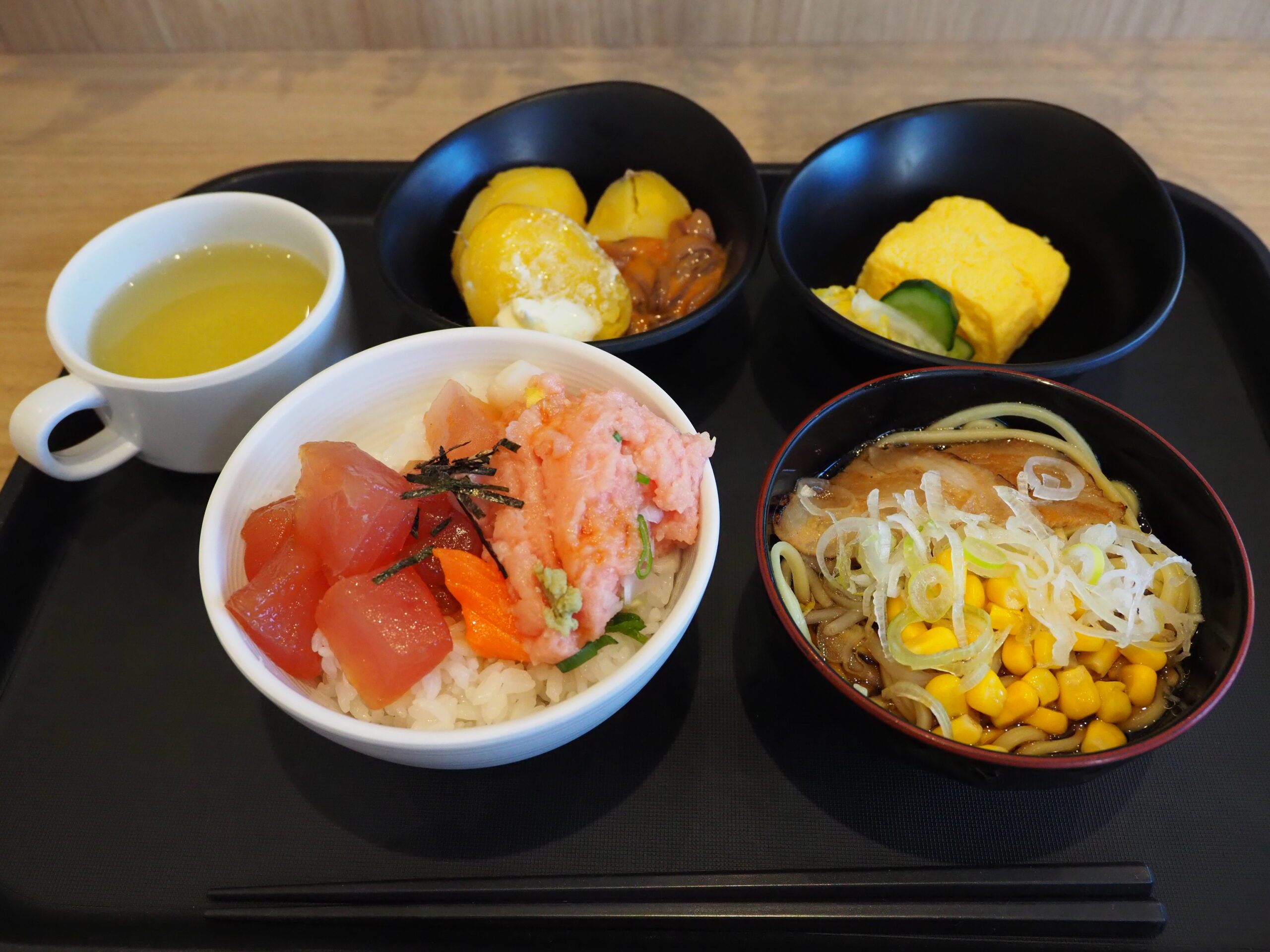 「海鮮丼」に「(何故か)旭川ラーメン」、「じゃがバター」の豪華朝食。